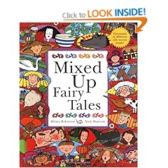 Kieran just got a new book: Mixed-Up Fairy Tales, by Hilary Robinson and Nick Sharratt. The book divides a bunch of fairy tales into 4 sections, and then the child can mix up these sections to create crazy tales. For example, they can read a story about Cinderella climbing a beanstalk to find a bowl of soup, or Puss in Boots being tormented by two step-sisters and finding a cave full of treasure that was stolen by a troll. The pages are colour-coded, so you can find the proper story if you want. The combinations are quite funny, though, and provide lots of entertainment.